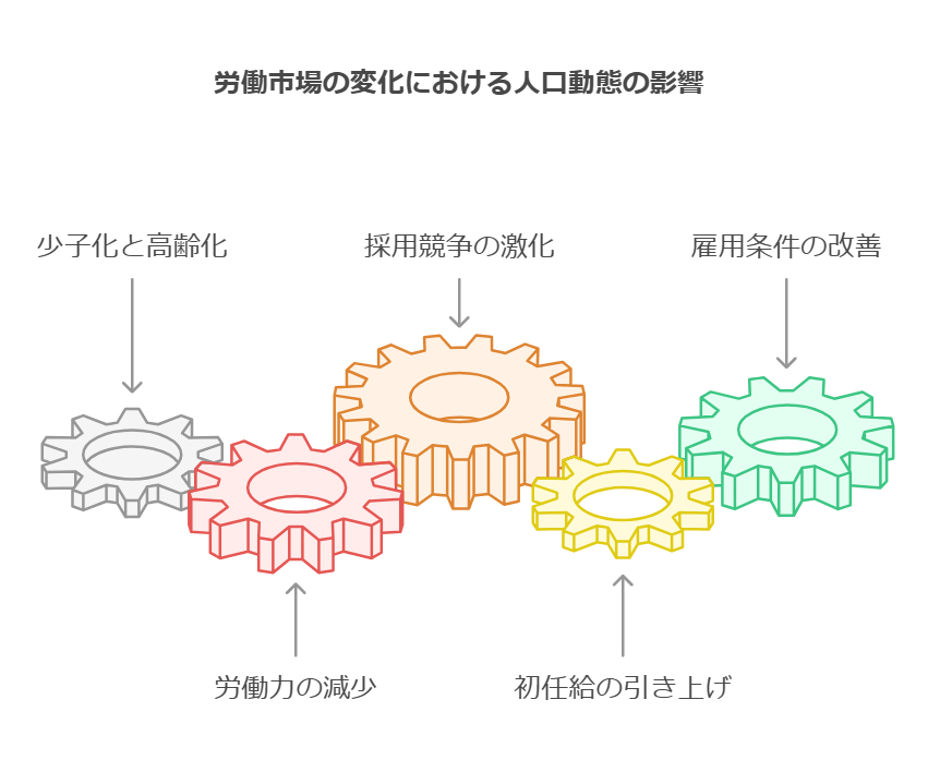 少子化と高齢化が進む日本では、労働人口の減少が続き、企業間の採用競争が激化しています。この競争は、新卒初任給の引き上げや雇用条件の改善といった動きにつながっています。