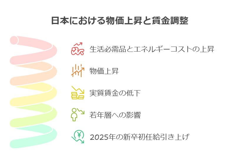 近年、日本では生活必需品やエネルギー価格の上昇を背景に、物価が上昇し続けています。この動きは、実質賃金の低下を招き、特に若年層の生活に大きな影響を与えています。2025年の新卒初任給引き上げも、こうした物価上昇への対応策の一環といえます。