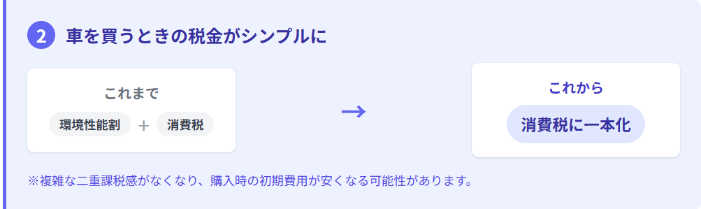 - 変更案: この複雑な仕組みを解消するため、「環境性能割」を廃止し、「消費税」に一本化する方向で検討が進んでいます。