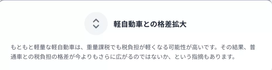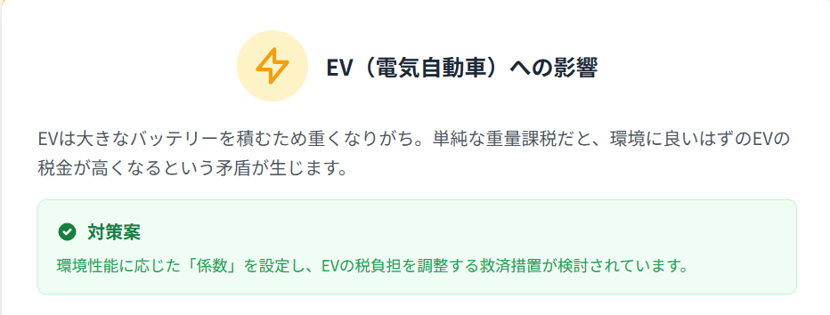 - EV(電気自動車)への影響 EVは航続距離を伸ばすために大きなバッテリーを積む必要があり、同じサイズのガソリン車より重くなる傾向があります。単純に重さだけで課税されると、環境に良いはずのEVの税金が高くなってしまう矛盾が生じます。 →対策: この問題に対処するため、環境性能に応じて税負担を調整する「係数」を設ける救済措置が検討されています。