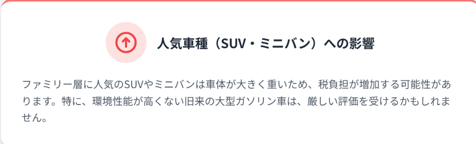 - 人気車種(SUV・ミニバン)への影響 ファミリー層に人気のSUVやミニバンは、車体が大きく重いため、税負担が増加する可能性があります。特に、環境性能があまり高くない旧来の大型ガソリン車は、厳しい評価を受けるかもしれません。