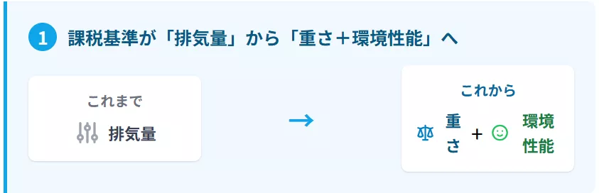 - 課税基準が「排気量」から「重さ+環境性能」へ