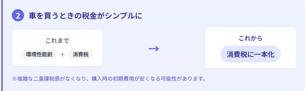 - 変更案: この複雑な仕組みを解消するため、「環境性能割」を廃止し、「消費税」に一本化する方向で検討が進んでいます。