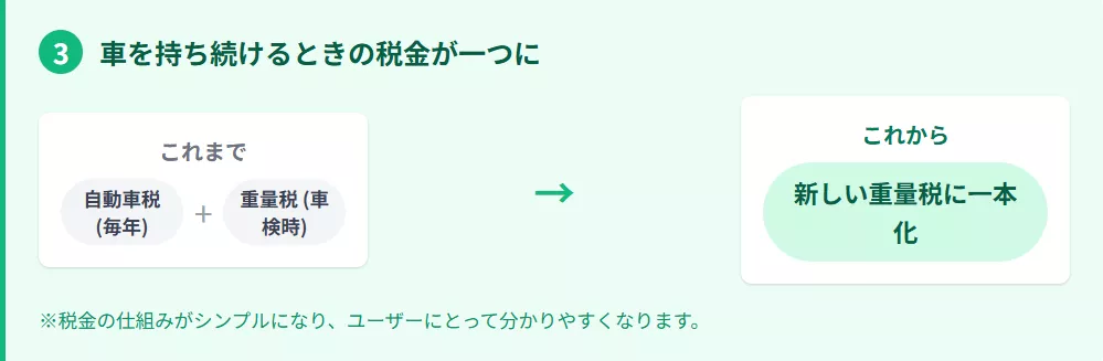 - 税制の簡素化 「毎年払う税金」と「車検の時に払う税金」が一つになることで、ユーザーにとって税金の仕組みが非常にシンプルで分かりやすくなります。