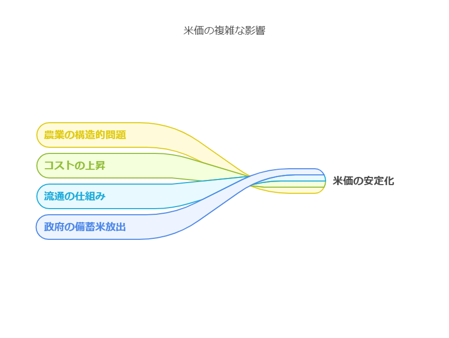 このように、政府による備蓄米放出という対策がありながらも、流通の仕組み、コストの上昇、そして日本の農業が抱える構造的な問題が複合的に作用し、価格が下がりにくい状況を生み出していると考えられます。
