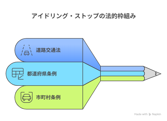 法律(道路交通法)とは別に、多くの自治体(都道府県や市町村)が、環境確保のために「アイドリング・ストップ(駐停車時のエンジン停止)」を条例で義務付けています。