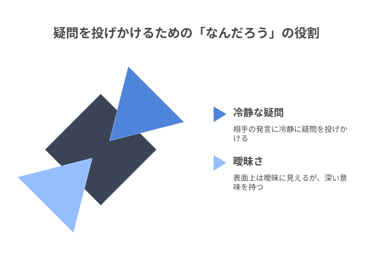 「なんだろう」は、相手の主張に対して直接反論するのではなく、相手が自らその矛盾に気づくように仕向ける控えめな一撃と言えるでしょう。