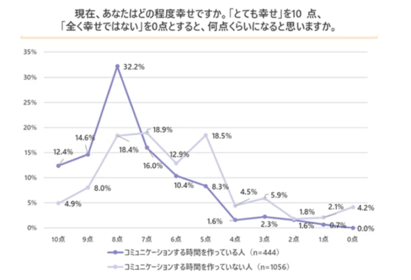 コミュニケーションの時間を作っている人と作っていない人の2軸と、幸福度の平均値を掛け合わせて見てみたところ、他の人とコミュニケーションする時間を作っている人の幸福度の平均値は「7.46点」、作っていない人は「6.11点」で、日頃から他の人とコミュニケーションする時間を作っている人の方が圧倒的に幸福度が高くなっています。