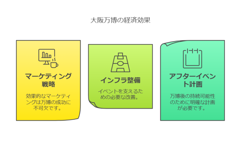 一方で、万博の成功に向けた 戦略的なマーケティングやインフラ整備、アフタープランの明確化 が不可欠です。