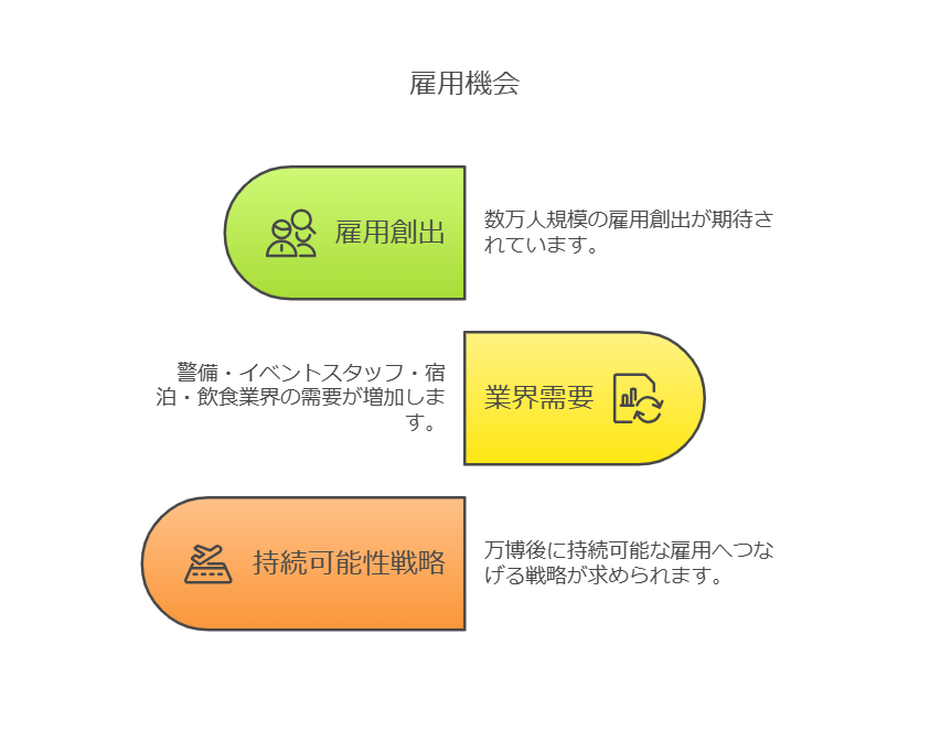 - 雇用の創出:万博関連の人材需要(警備、イベント運営、飲食・宿泊業)