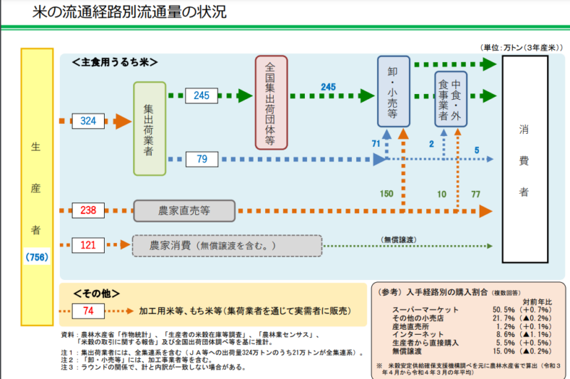 コメは生産者から消費者に届くまでに、多くの流通業者を経由します。そのため、流通コストが積み重なり、価格の下落が抑制される構造になっています。