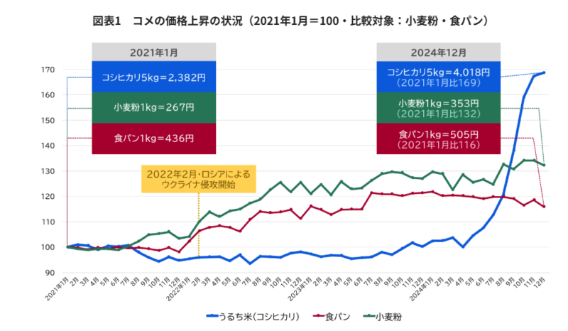 特に、2024年後半からのコメ価格高騰は、異常気象による生産量の減少や流通の混乱が影響していました。