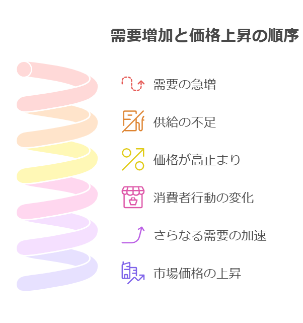 - 逆に「買い控え」が発生すると、需要が減少し、価格が下がる可能性があります。