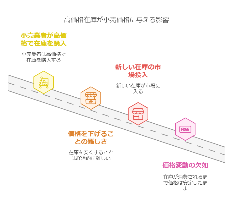 - 流通業者が高値で仕入れた在庫を抱えている → 安く売ると損失が出るため、価格を下げることが難しい。