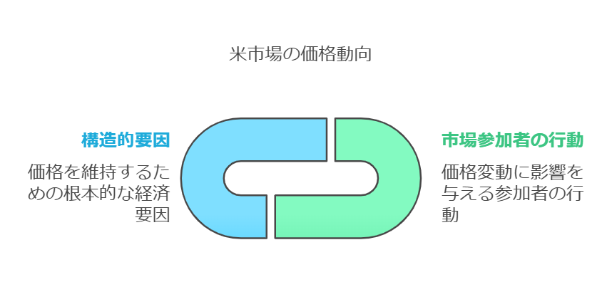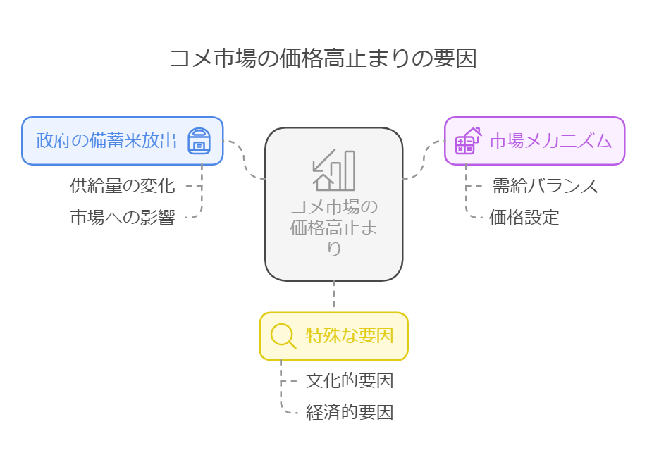 コメ価格は、多くの要因によって決まります。現在の価格変動を引き起こしている要因を整理すると、以下のようになります。