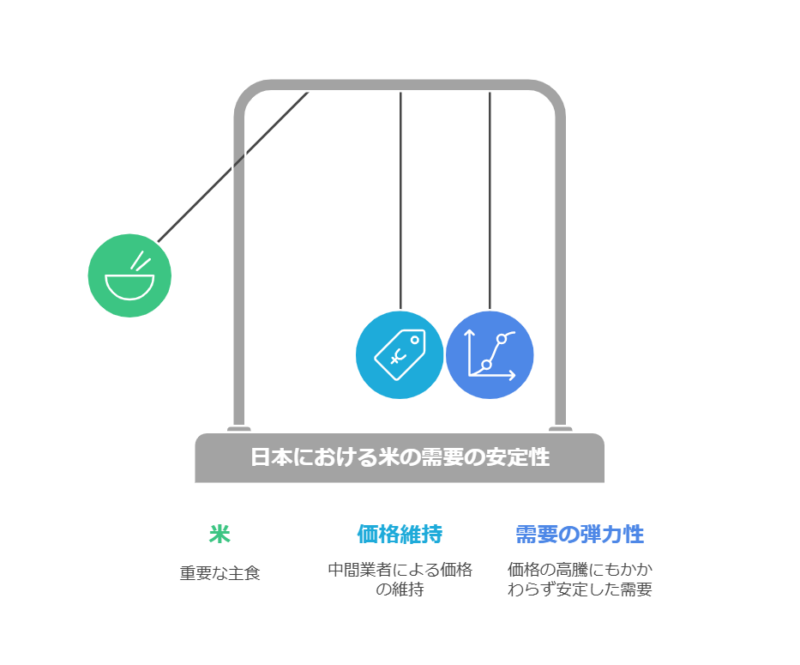 - 消費者の価格認識が固定化される → 価格が上がると「コメは高いもの」という認識が広まり、多少の価格下落では購買行動が変わりにくい。