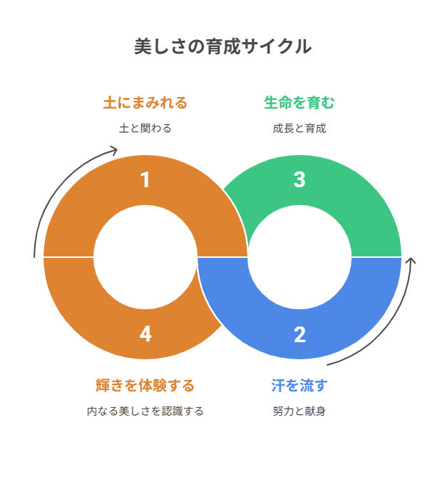 美しさは、完璧に着飾ることだけにあるのではない。土にまみれ、汗を流し、生命を育むプロセスの中にこそ、本当の輝きや豊かさがある。
