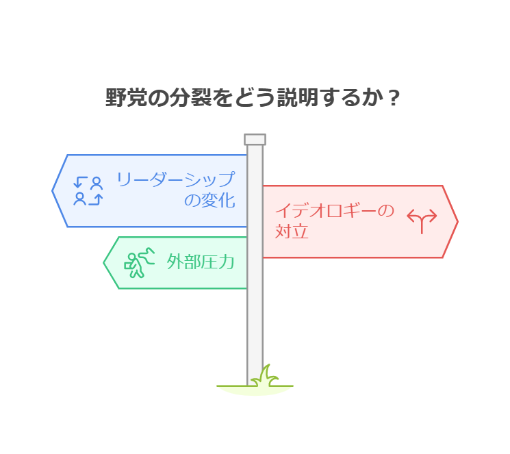 - 理念や政策の不一致 → 野党はしばしば政策の統一が難しく、内部分裂を起こしやすい。