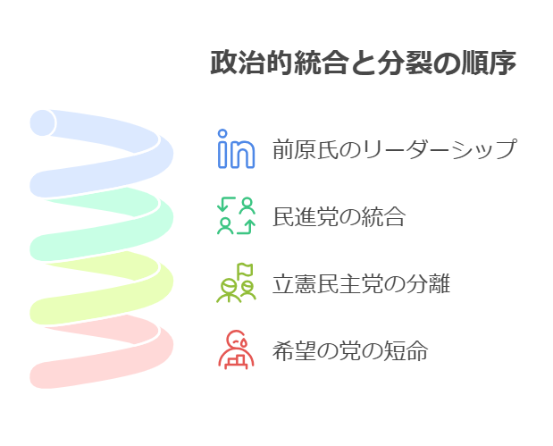 特に希望の党の分裂は象徴的な出来事でした。前原氏は2017年の衆院選で民進党の希望の党への合流を主導しましたが、結果的に民進党の一部が立憲民主党として独立し、希望の党自体も短命に終わりました。