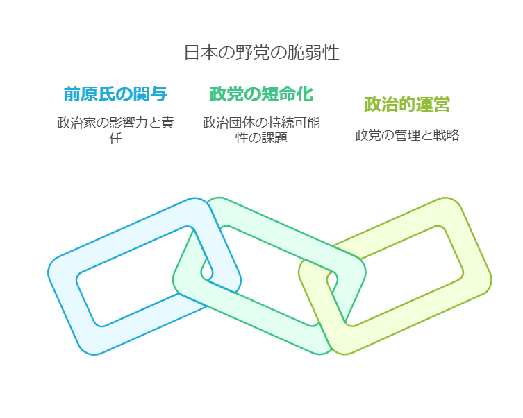 日本では、特に野党側で政党の短命化が問題視されています。前原氏が関わった政党が相次いで消滅したことは、個人の問題だけでなく、野党の政党運営が脆弱であることを示唆しています。