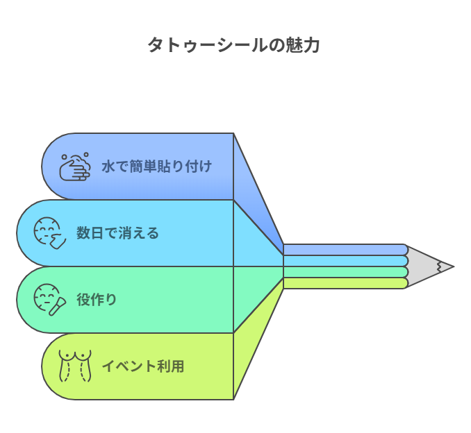 近年、芸能界でもファッションとして手軽に楽しめる「タトゥーシール」が人気です。水で簡単に貼り付けられ、数日で消えるため、役作りやイベントなどで利用されることも少なくありません。