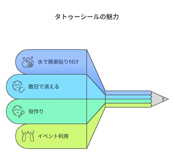 近年、芸能界でもファッションとして手軽に楽しめる「タトゥーシール」が人気です。水で簡単に貼り付けられ、数日で消えるため、役作りやイベントなどで利用されることも少なくありません。